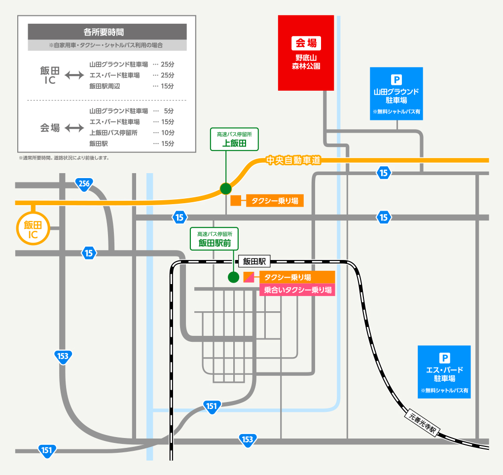 ※本年は「丸山小学校無料駐車場」並びに「飯田駅有料シャトルバス」は、運営・運行しておりません。
